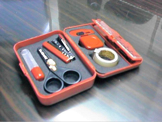 中身は、セロテープ、ホッチキス、はさみ、のり、カッター、巻尺(1m)、